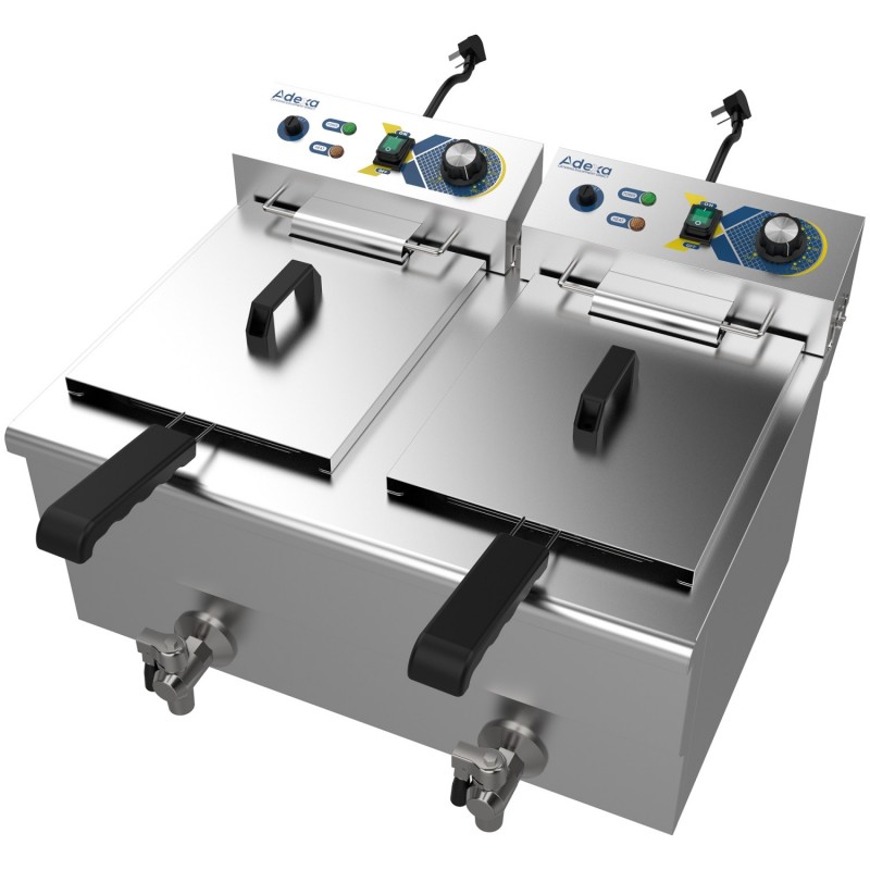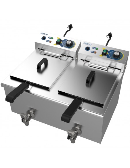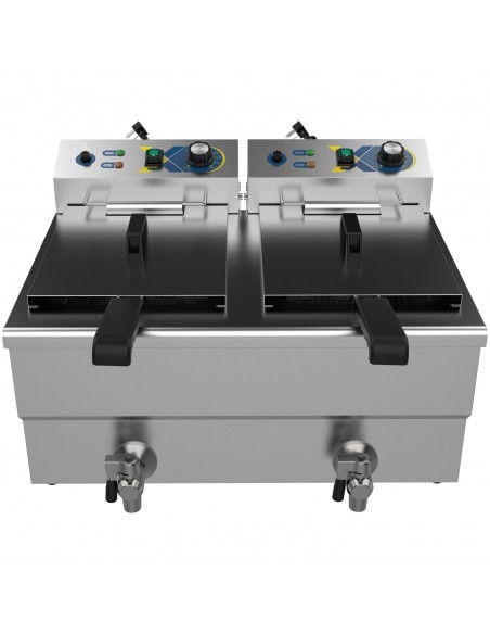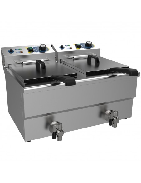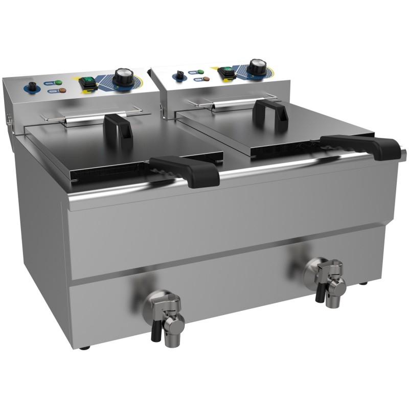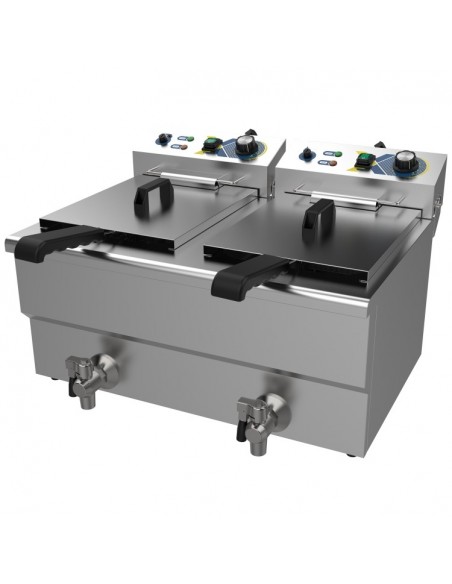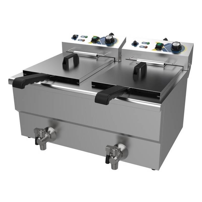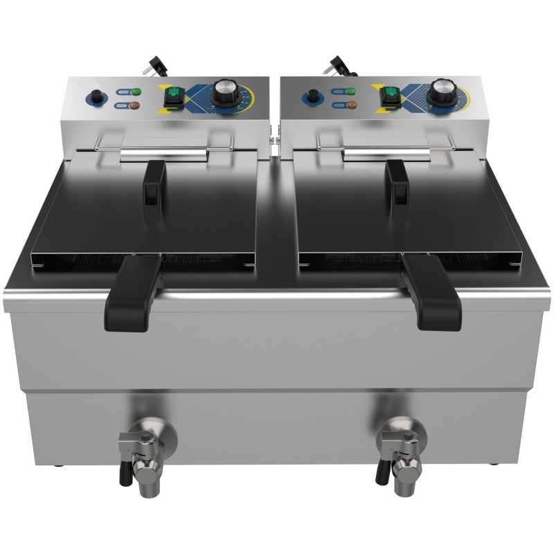 For enhanced usability and safety, the fryer is equipped with dual stainless steel lids to reduce heat loss and oil splatter, as well as two front-mounted drain taps for safe, clean, and efficient oil drainage. Despite its high capacity, the fryer maintains a compact footprint of 609 × 510 × 390 mm, making it ideal for countertops in restaurants, takeaways, cafés, food trucks, and catering operations.