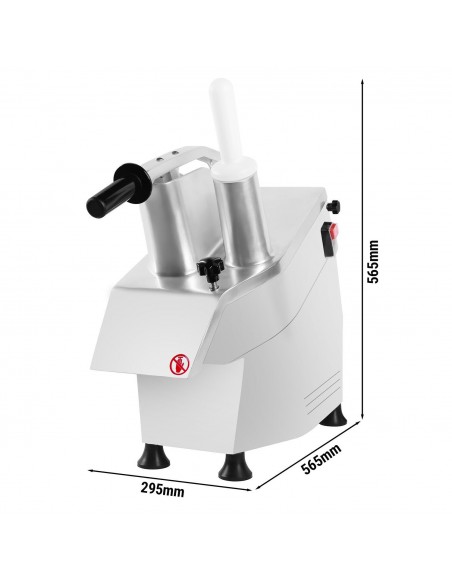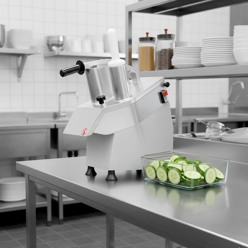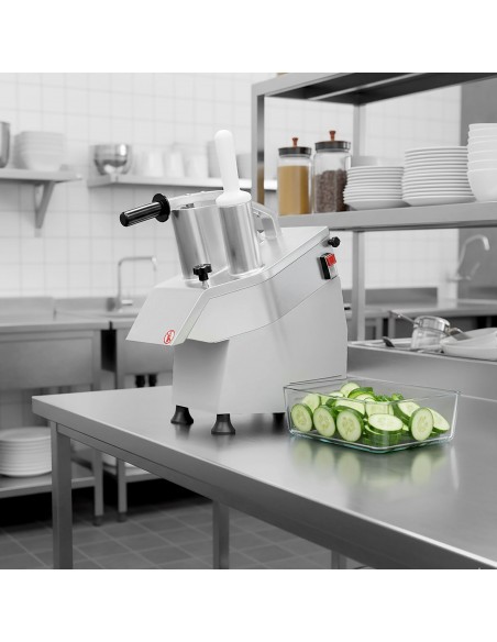With a robust 550W motor and a compact, space-saving design, this vegetable slicer allows chefs and kitchen staff to prepare vegetables and fruits quickly and accurately, significantly reducing prep time while maintaining uniform results.