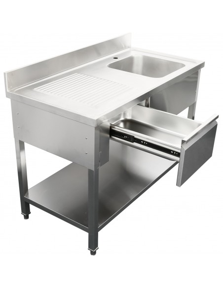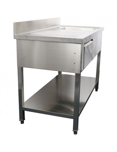 The sink is equipped with a single bowl positioned on the right-hand side, an integrated drawer for convenient storage, and a robust lower shelf for additional equipment or supplies. The anti-runoff edge helps contain water within the unit, while the 100 mm backsplash provides effective wall protection in busy kitchen environments.