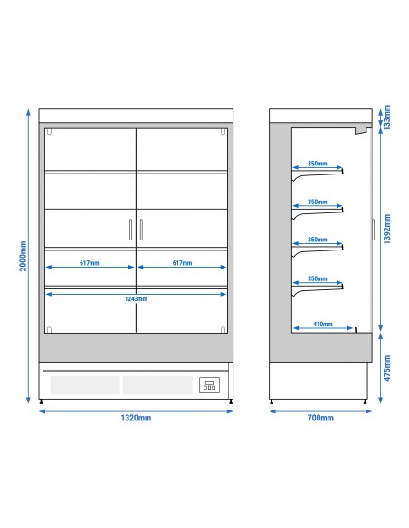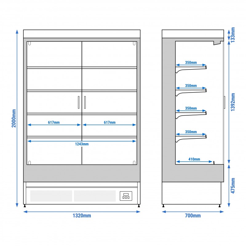 Multideck Refrigerated Display Cabinet 1320 mm - 595 litres - 2 frameless glass doors 4 shelves