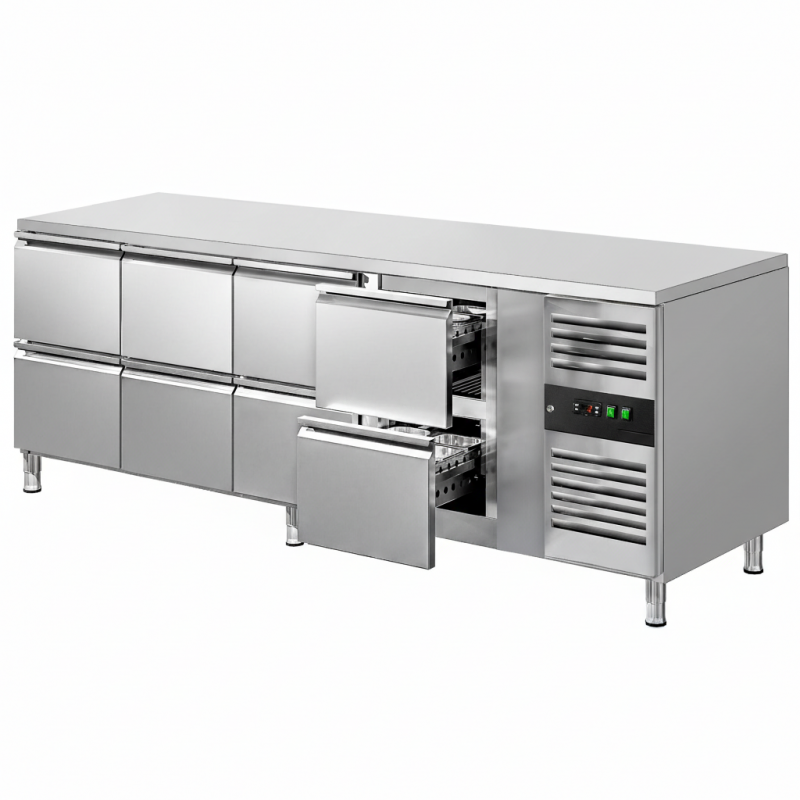 Built to withstand daily use, this unit combines excellent cooling performance with practical workspace. The spacious stainless-steel worktop doubles as a preparation surface, while the 8 GN 1/1 drawers offer ample refrigerated storage — putting ingredients right where you need them for quick service and efficient workflow.