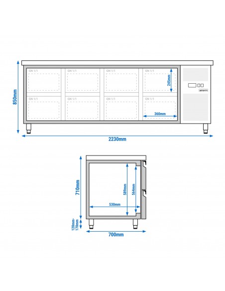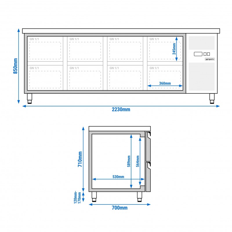 External Dimensions: approx. 2230 mm (W) × 700 mm (D) × 850 mm (H) — a professional-grade refrigeration solution that fits neatly into busy kitchen layouts.