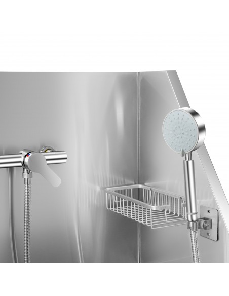 Equipped with a mobile hand shower and pre-drilled hot/cold water connection points, this grooming station lets you control water flow and temperature with ease. The S-shaped drain pipe helps isolate odours and keep the area fresh, while the included sieve prevents clogging from fur and debris. Storage space and a practical grid for care products ensure everything you need stays close at hand.