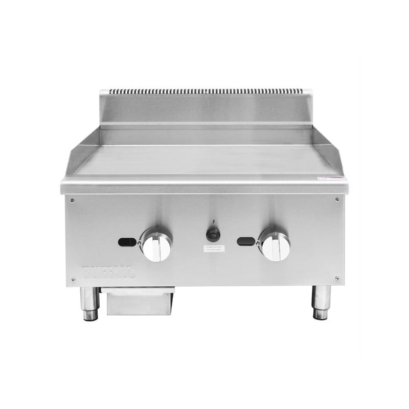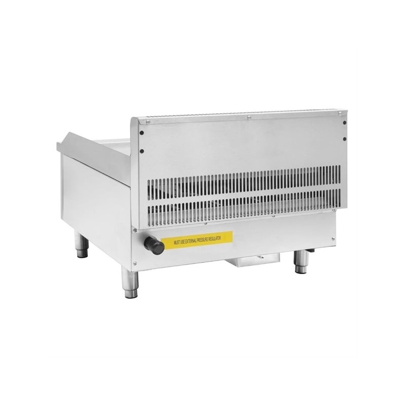 For safety and reliability, the griddle features flame failure protection and battery-operated impulse ignition, ensuring dependable lighting even during the busiest shifts.