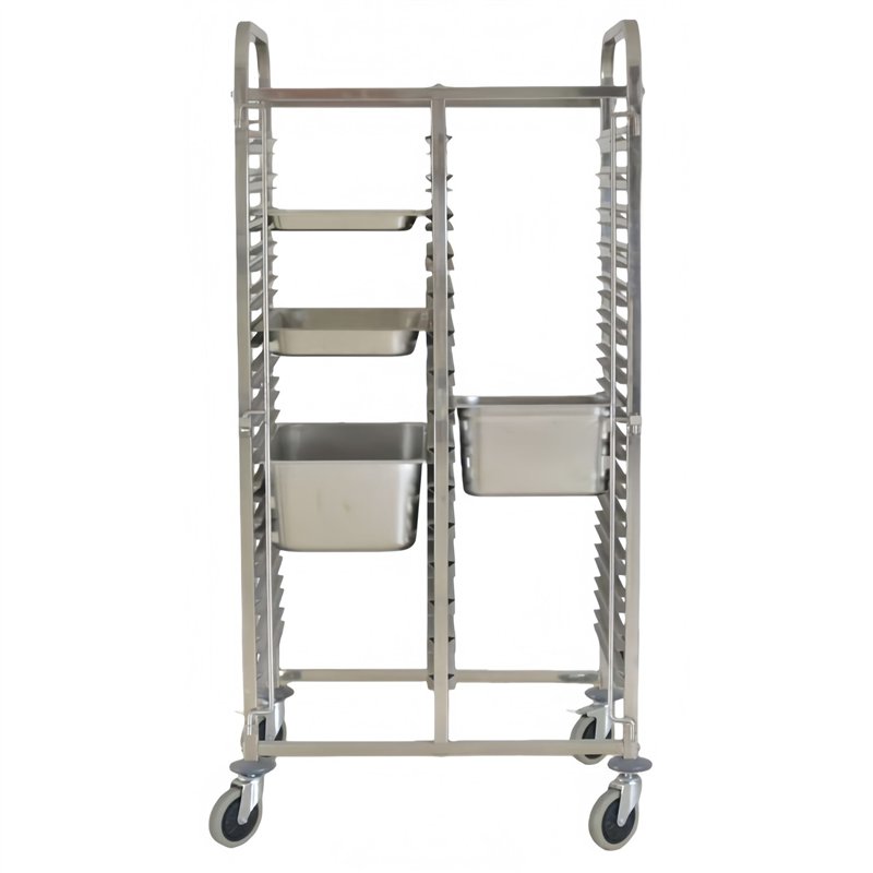 The twin-rack structure of the DA-JSN250 allows simultaneous access from both sides, improving workflow and enabling fast loading and unloading of GN pans. Its tall, vertical design maximizes storage volume without increasing floor footprint, making it ideal for compact but high-output kitchens. Fitted with smooth-rolling swivel casters and reinforced slides, the trolley supports reliable mobility even when fully loaded. This makes it a suitable choice for any commercial catering environment.