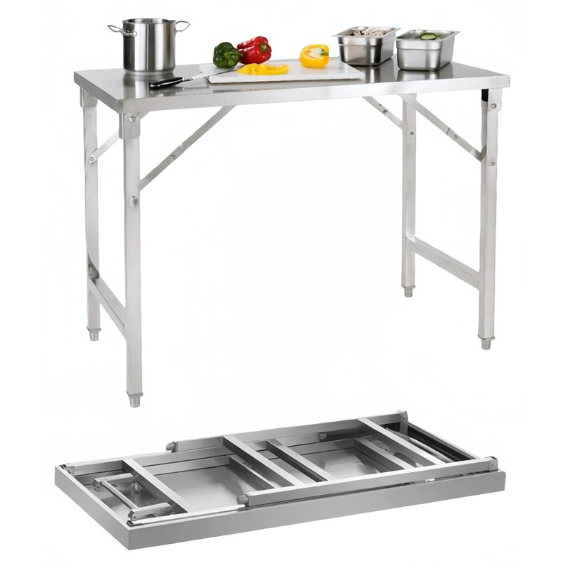 The DA-JSN258's easy-fold mechanism allows for quick setup and compact transport, making it ideal for temporary workstations, prep areas, buffets, mobile catering events, and small kitchens. The smooth stainless steel surface is easy to clean and suitable for food preparation, utensil handling, and general kitchen work. Despite its foldable structure, the table offers a strong load-bearing capacity, making it reliable for daily professional use. This makes it an excellent choice for any commercial catering environment.