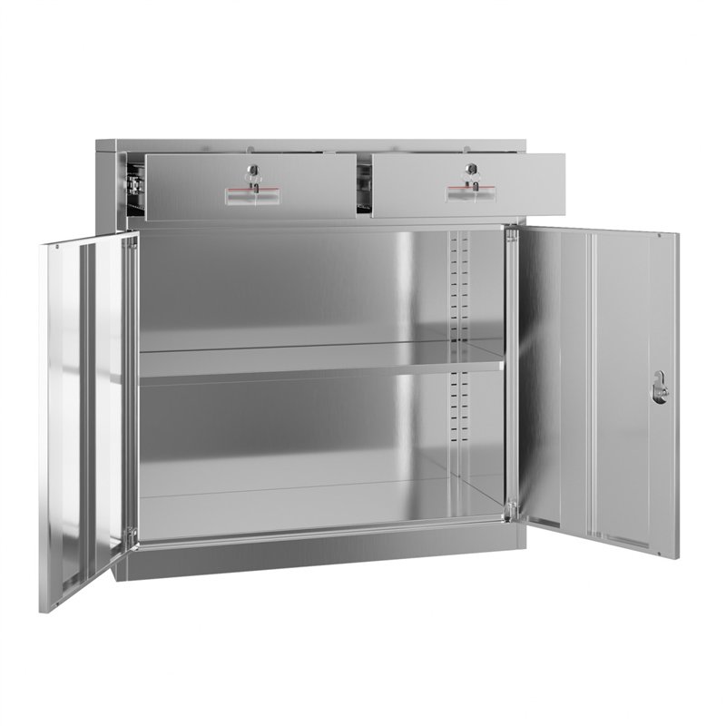 - Features a two-drawer and two-door layout for convenient access to both small items and larger supplies