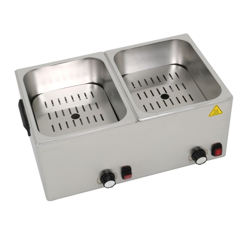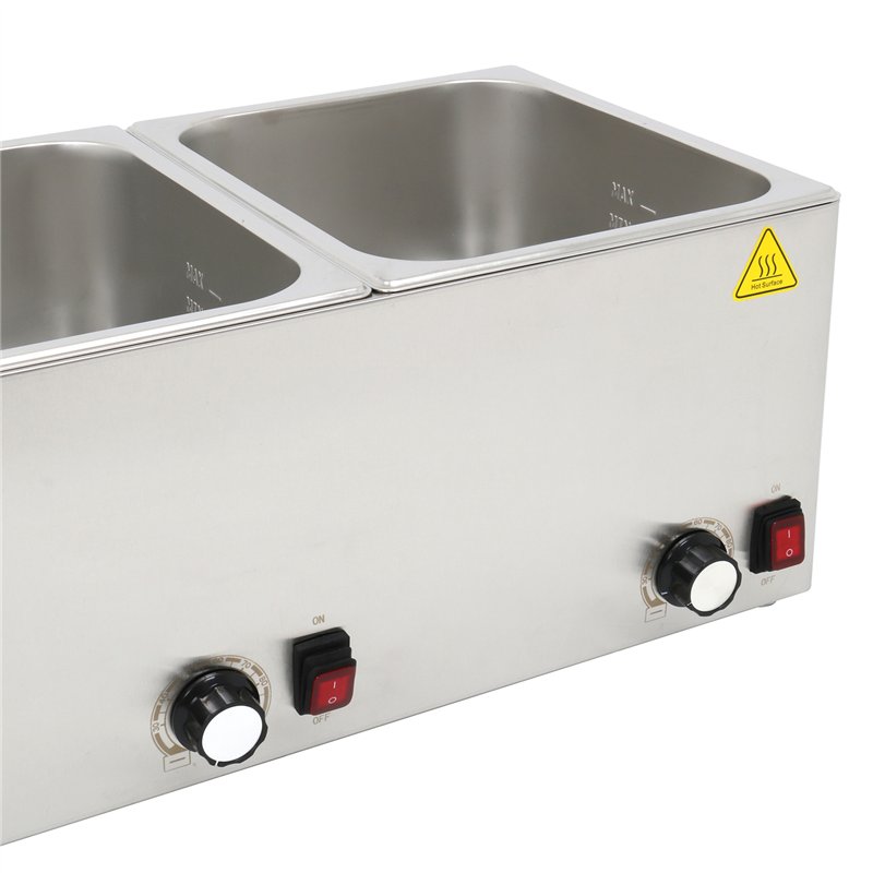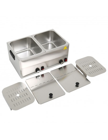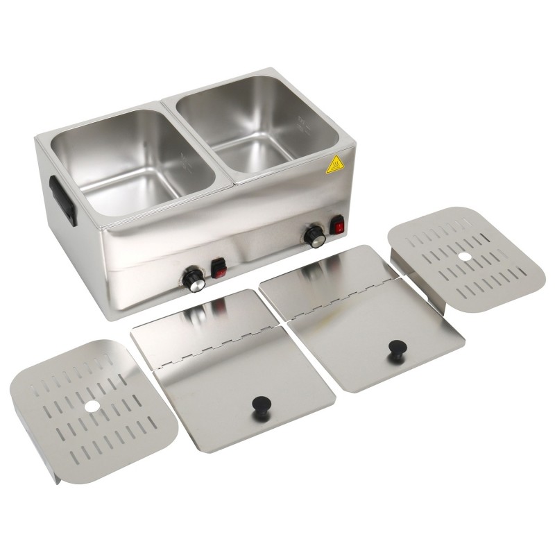 - Features: Hinged stainless steel covers for easy access and heat retention