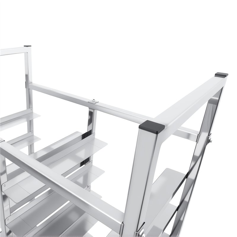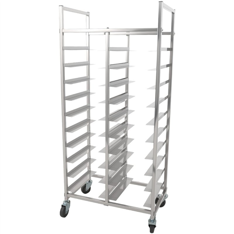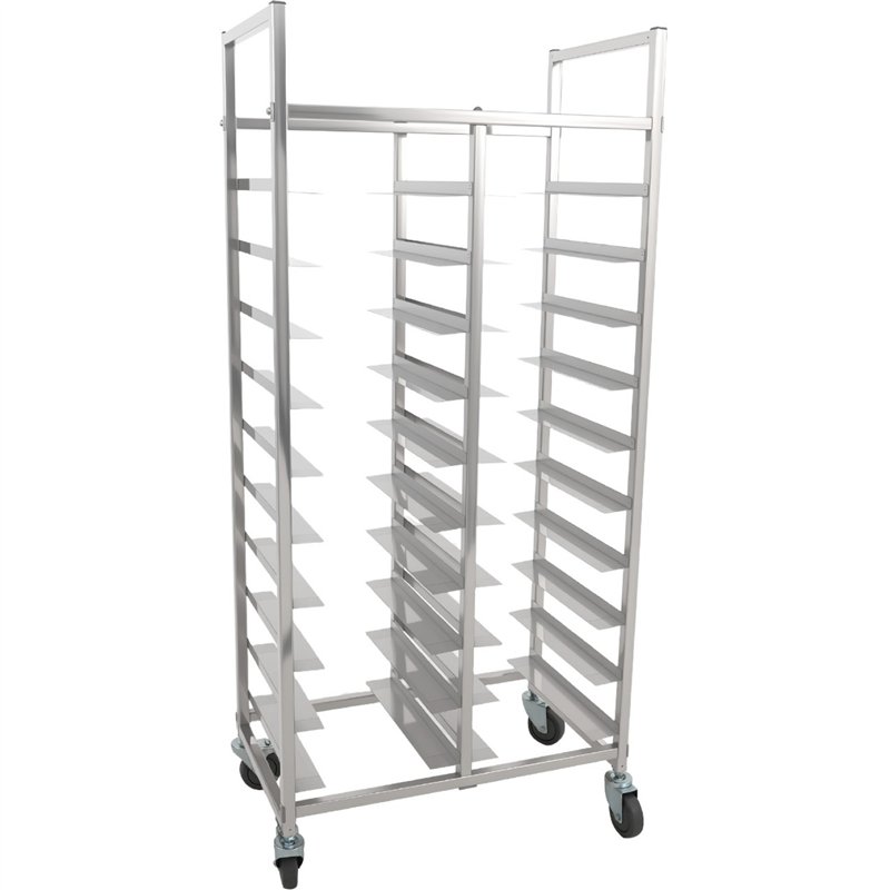 Featuring a dual-row 10+10 tier configuration, it offers high-capacity tray storage while maintaining a compact footprint, making it ideal for busy kitchens where efficiency and organization are essential. The open-frame design allows easy access from both sides, ensuring smooth loading and unloading during peak service hours.
