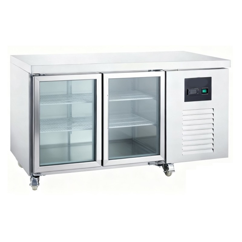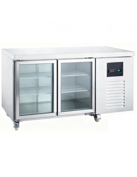 This commercial refrigerated counter combines ample chilled storage with a convenient workspace, making it ideal for busy professional kitchens, cafés, bars, and catering operations. Featuring dual glass doors for easy product visibility and access, it ensures efficient workflow while maintaining consistent temperatures for safe food storage.