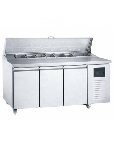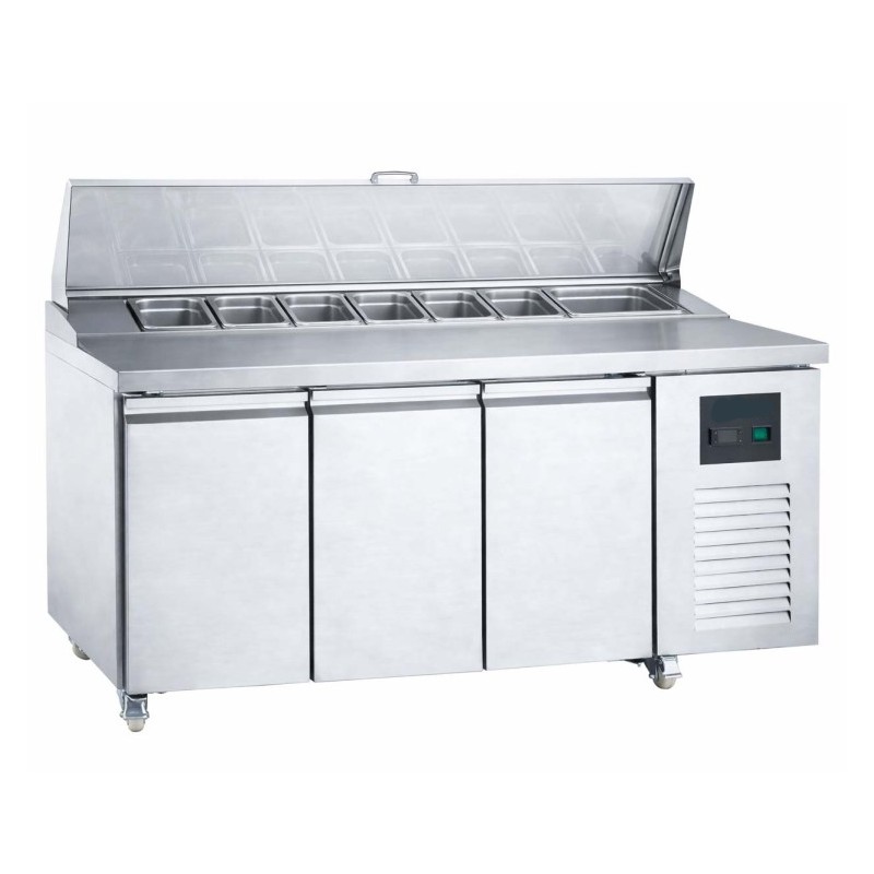 Constructed from durable SS201 stainless steel for both interior and exterior surfaces, this prep counter is built to withstand the demands of commercial environments while maintaining high hygiene standards. The stainless steel lift-off cover protects ingredients when not in use, and three solid stainless steel doors with horizontal metal handles provide easy access to storage.