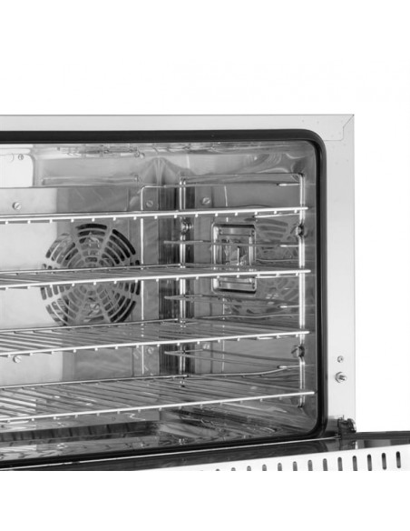 Equipped with a high-performance convection fan, the oven ensures rapid heat-up times and even temperature distribution throughout the chamber—essential for uniform baking and perfect finishes. The push-button steam injection function, powered by an integrated water pan, helps maintain moisture levels for improved texture and crust development, without the need for a mains water connection.