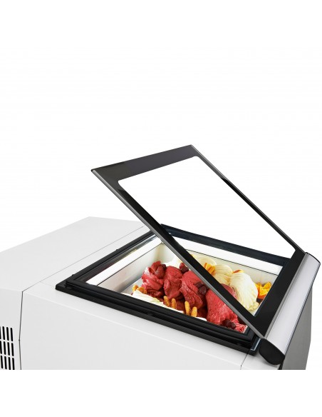 Designed for commercial use, the unit is constructed with robust stainless steel, a heatable pane to minimise condensation and smooth-opening lids for convenient access. The countertop design saves valuable floor space while presenting your flavours attractively to customers.