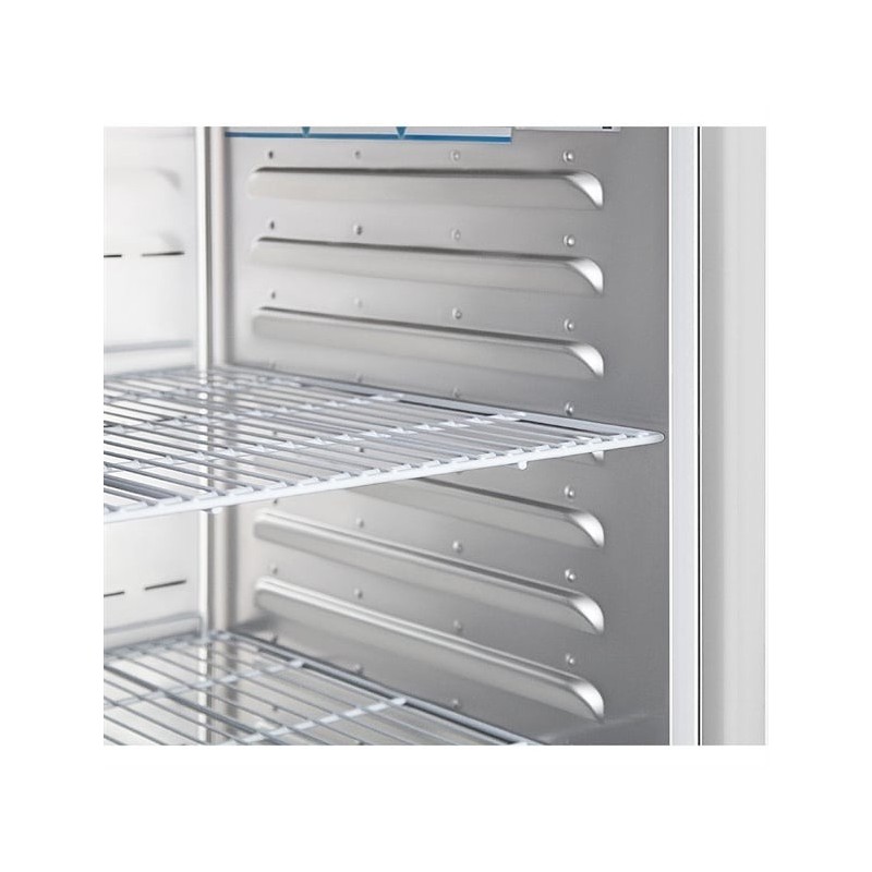 The fridge is powered by a forced-air cooling system, delivering rapid temperature recovery even during frequent door openings. Self-closing doors, automatic heated defrost, and a user-friendly digital controller with an always-on LED display enhance efficiency, reduce running costs, and simplify day-to-day operation. Six sturdy adjustable shelves plus two floor protector shelves provide flexible storage options, while heavy-duty lockable castors allow effortless repositioning for cleaning or installation.