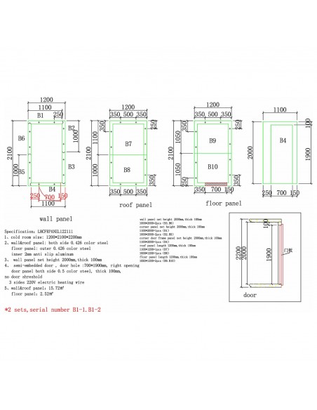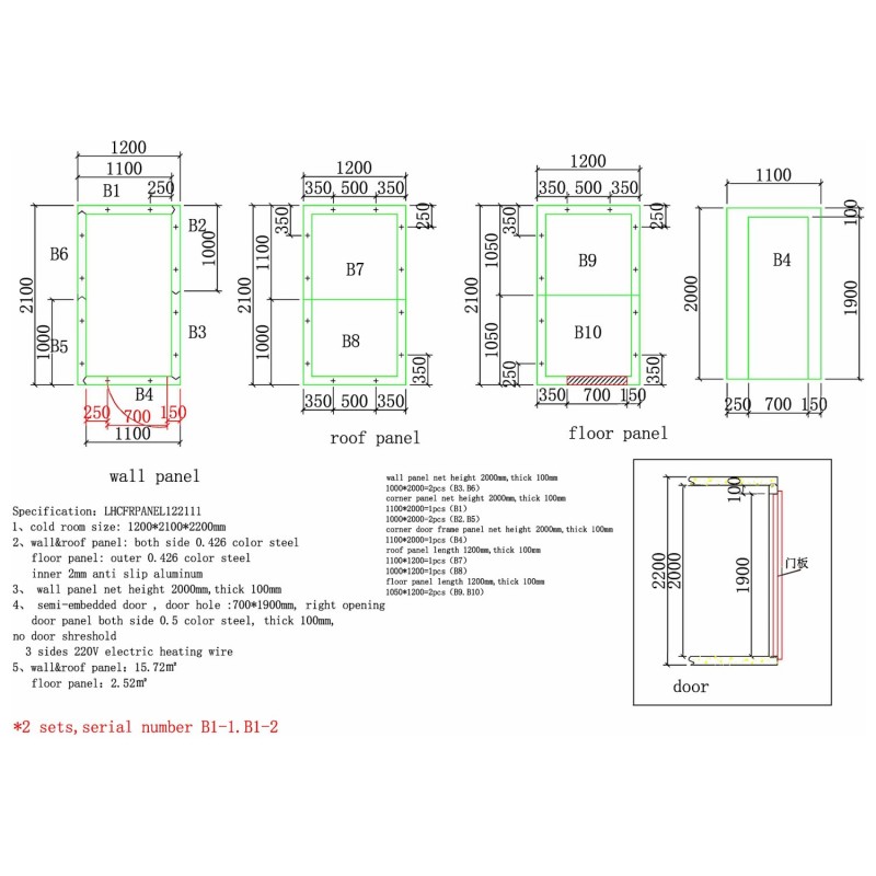 - Overall cold room size (W×D×H): 1200 × 2100 × 2200 mm