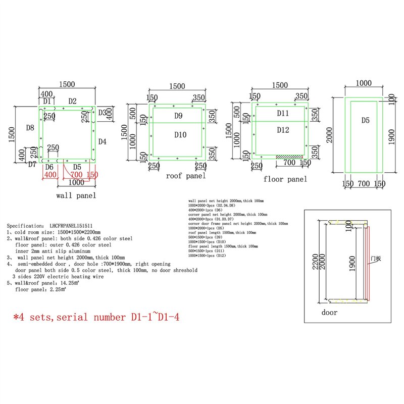 - Overall cold room size (W×D×H): 1500 × 1500 × 2200 mm