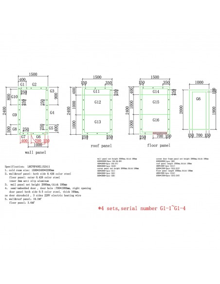 - Overall cold room size (W×D×H): 1500 × 2400 × 2200 mm