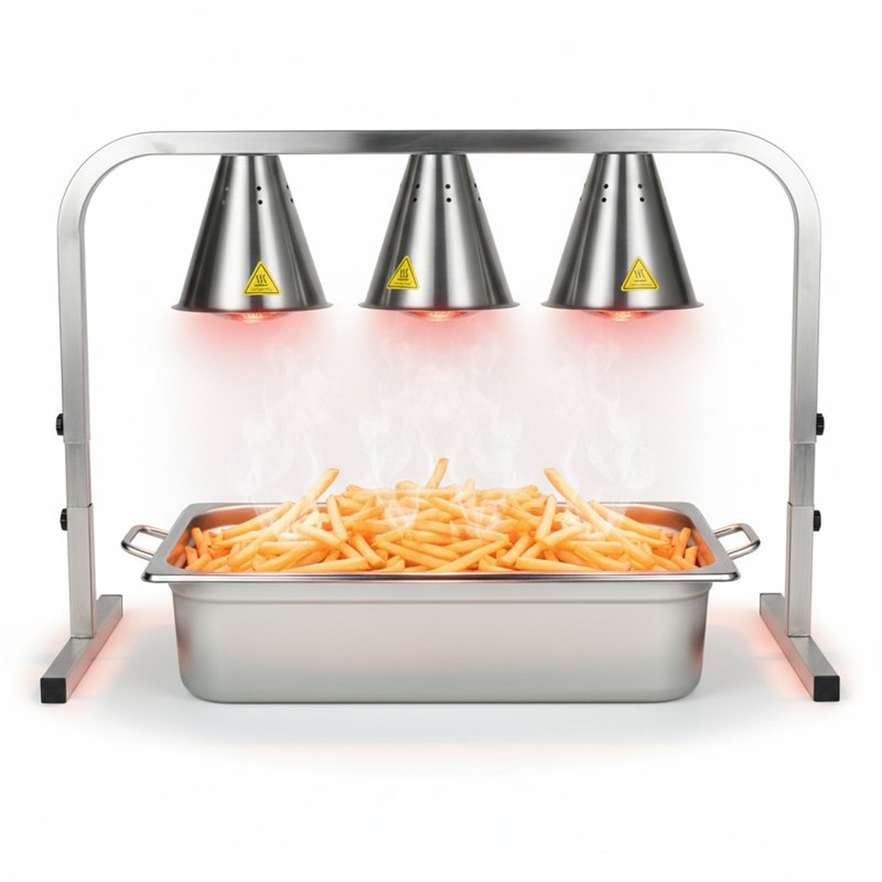 - Equipped with three infrared heating lamps for wide, even heat distribution