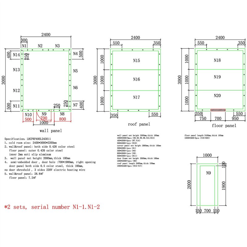 - Overall cold room size: 3000 × 2400 × 2200 mm with 2000 mm internal panel height