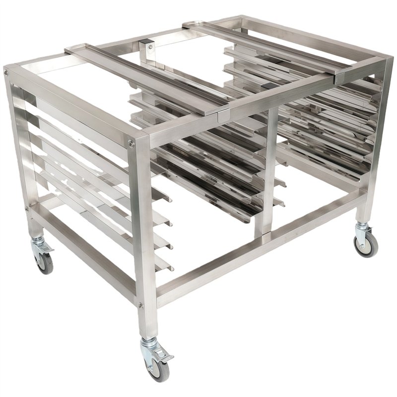- Dual rail system compatible with GN 1/1 and 60x40 bake pans for versatile tray storage