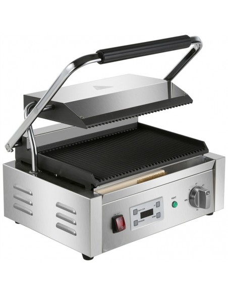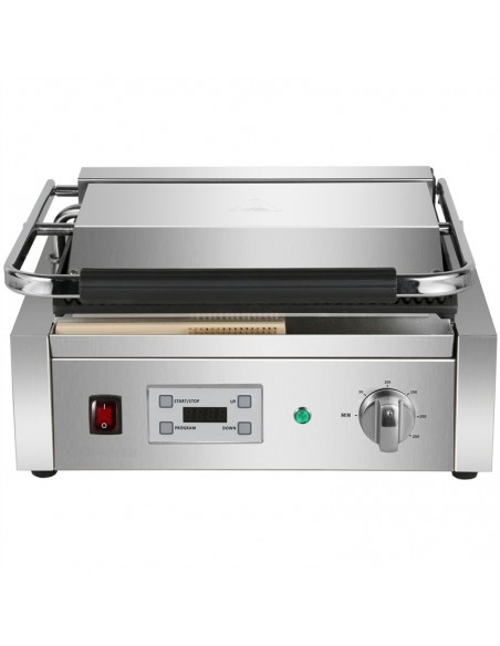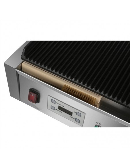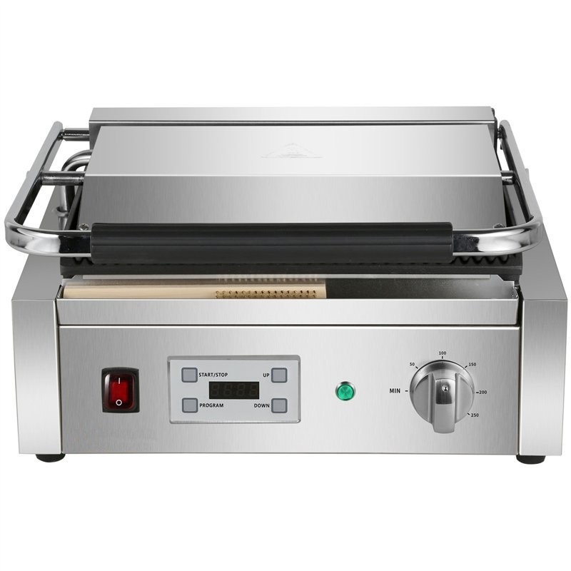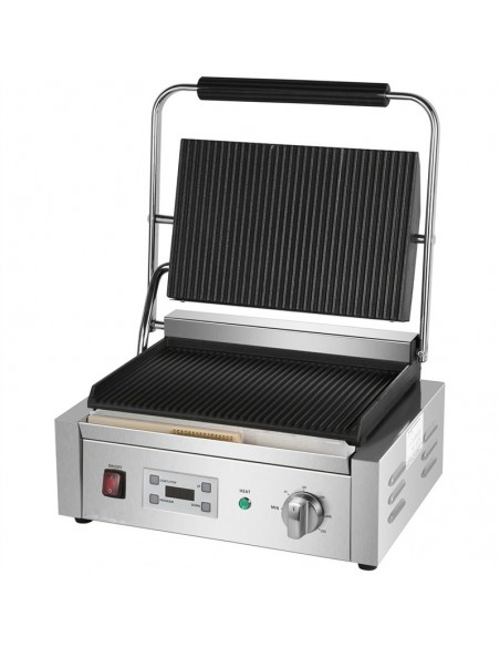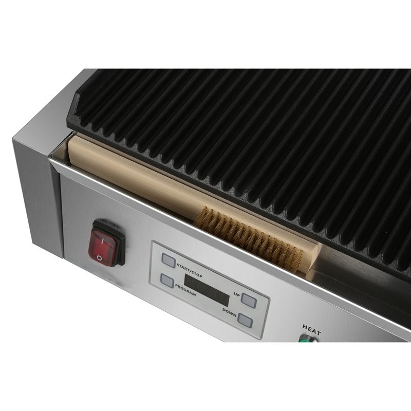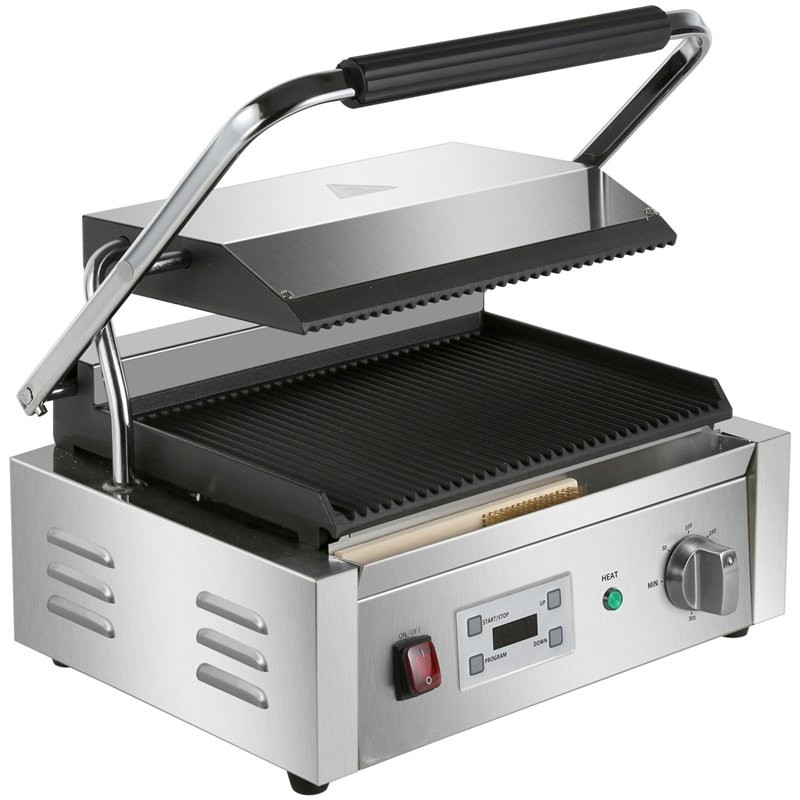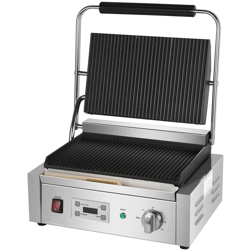 - Extra large commercial contact grill with ribbed top and bottom cast iron grill plates