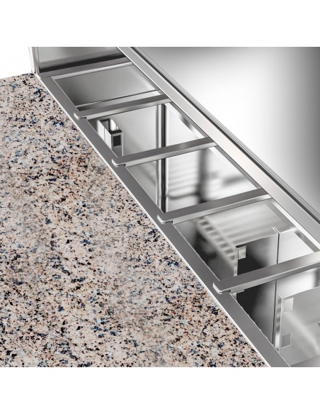 This premium refrigerated prep counter is designed for demanding commercial kitchens requiring reliable chilled storage, efficient food preparation and a professional finish. Ideal for pizzerias, restaurants, cafés, takeaways and catering environments, the unit combines high-performance refrigeration, low energy consumption, and a durable granite work surface for intensive daily use.