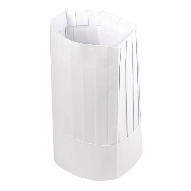 Toque chefs hats made out of paper these come in packs of 50 and can be disposed off. They are flat packed and only come in one size.