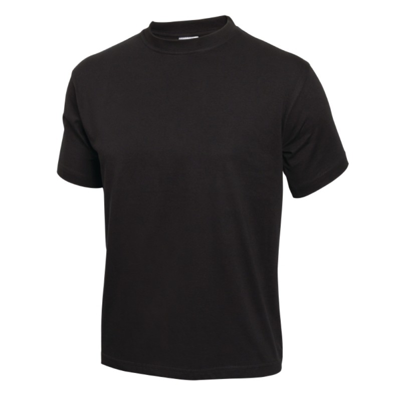 100% black cotton t-shirt with a tubular body construction for shape retention featuring a comfortable rib knit collar perfect for kitchen wear.