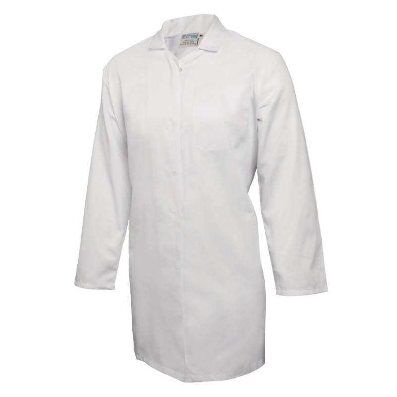 Durable white food hygiene coat by Whites for men featuring no external pockets making it suitable for food hygiene purposes with concealed stud fasteners and an inside breast pocket.