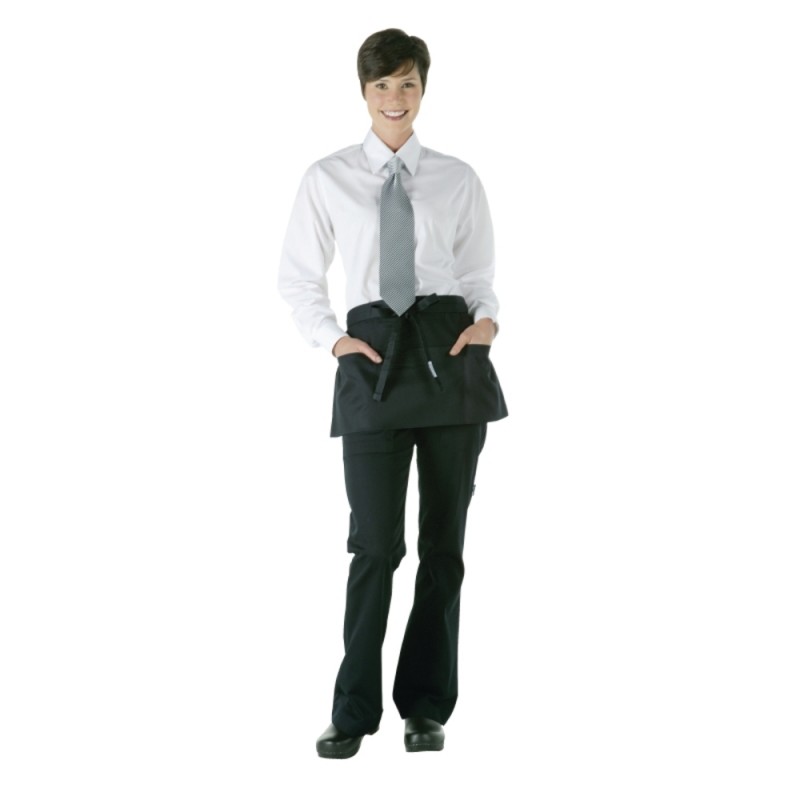 Durable and stylish high quality polycotton short bistro waist apron in black perfect for waiters and waitresses featuring a user friendly patch pocket on the front.