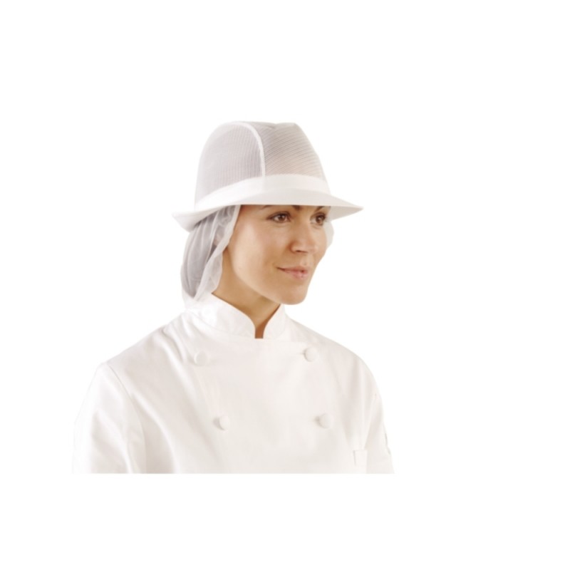 This white trilby hat with a snood (M) is made from a lightweight material. Suitable for a all day wear this hat is ideal for catering staff which will keep your hair tied back when working.