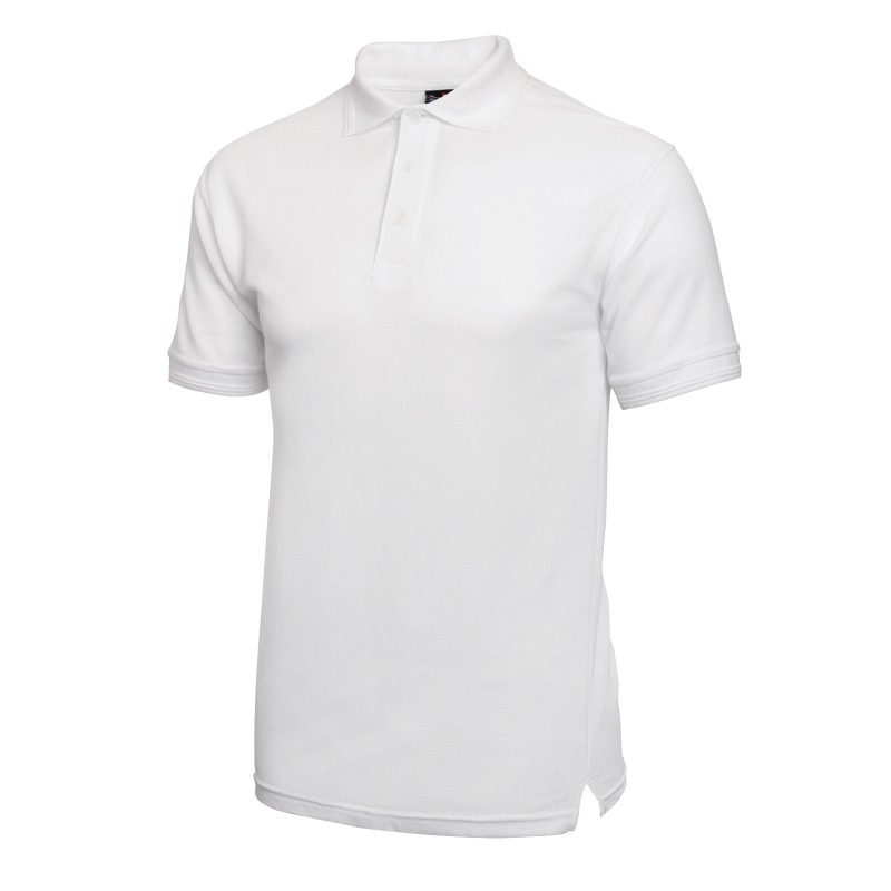 Hardwearing polycotton ring spun white polo shirt with tapered neck reinforced shoulders ribbed cuffs on sleeves and self coloured buttons. Suitable for commercial laundering.
