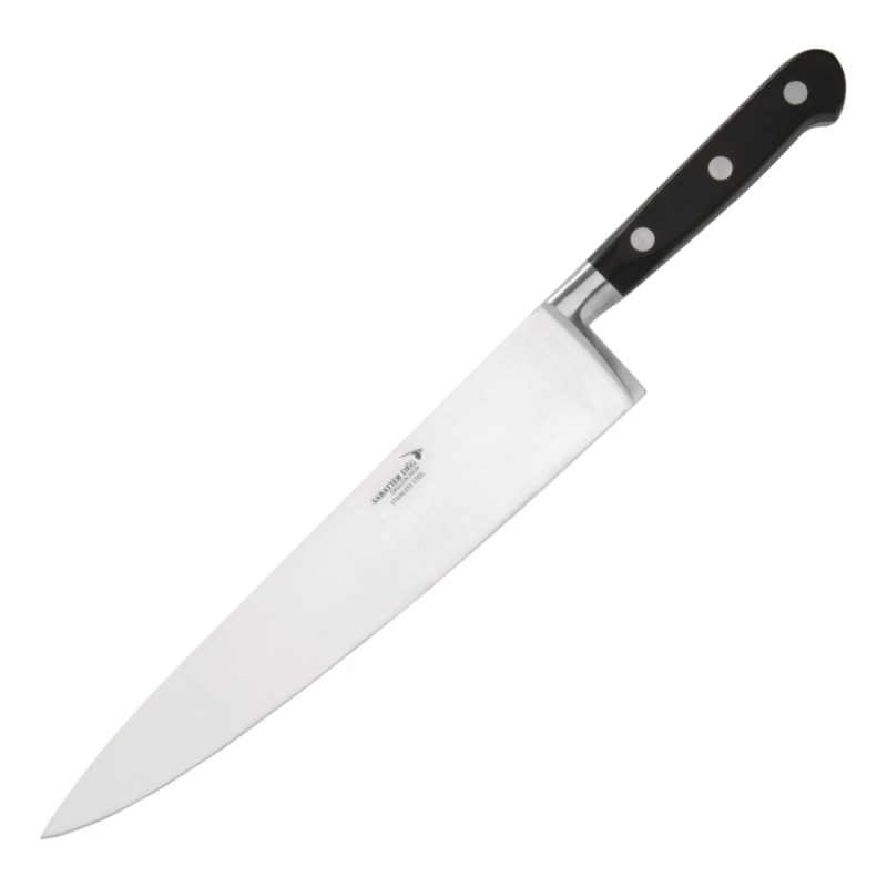 Professional quality chefs knives by Dglon Sabatier this cooks knife features a black thermoplastic handle and a long stainless steel blade. These knives are produced by one of the original factories that created the famous Sabatier reputation for quality making this the perfect knife for everyday professional kitchen use.