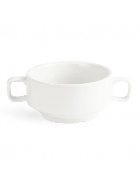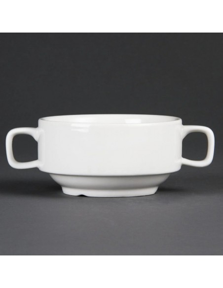 Great value pure white porcelain soup bowls with handles by Olympia for your day to day catering needs. Durable and versatile these bowls are easily stackable and contain strengthened rolled edges for chip resistance.