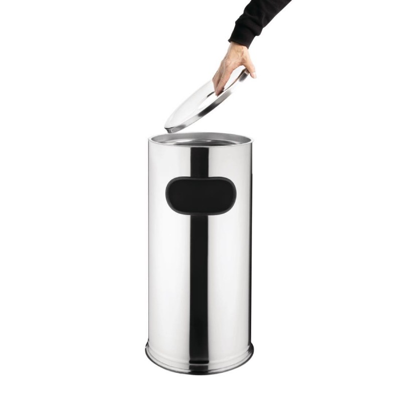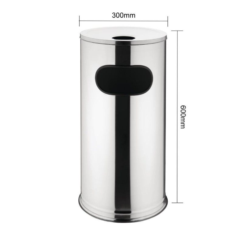 Stylish mirror finished 18/0 stainless steel Bolero cigarette bin with separate removable ash tray on top and a stylish appearance. Comes in two different sizes.