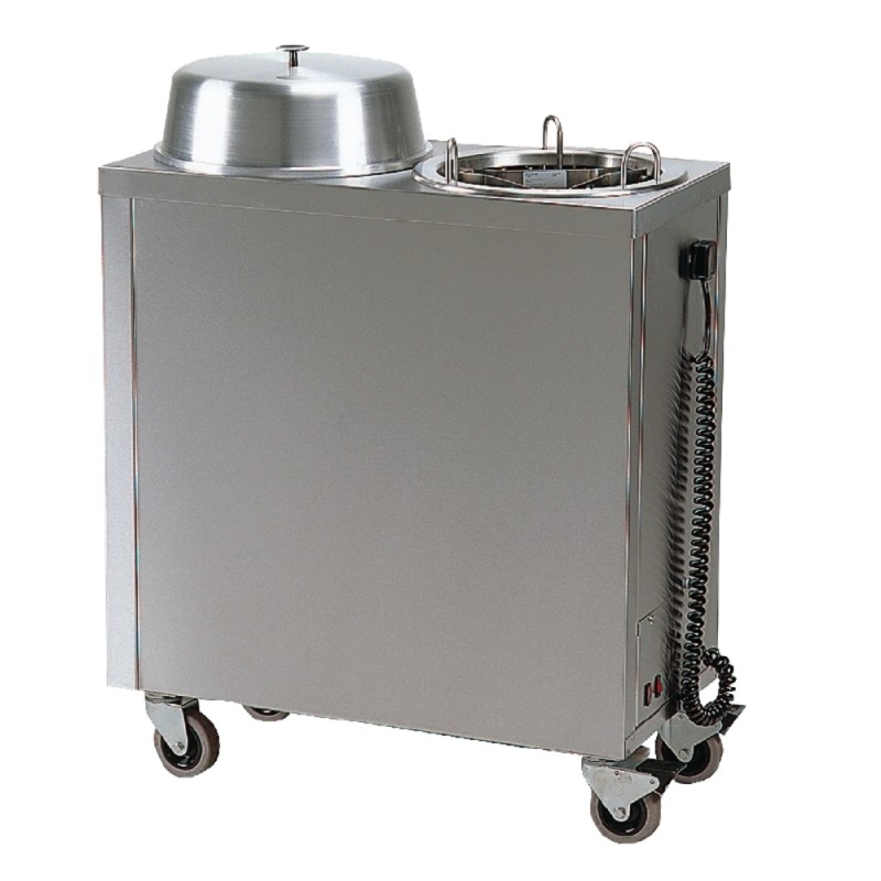 Mobile heated plate dispenser with lid constructed from stainless steel.