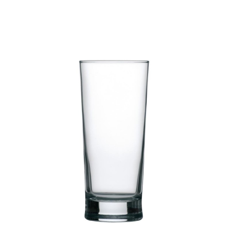Simple conical all-purpose pint glass. Nucleated to retain head and fizz in carbonated drinks. CE marked.