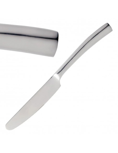Distinctive contemporary styling with subtly waved handles that fit the contours of the hand. Durable forged 18/10 high polish stainless steel.