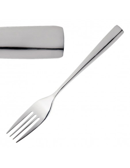 Distinctive contemporary styling with subtly waved handles that fit the contours of the hand. Durable forged 18/10 high polish stainless steel.