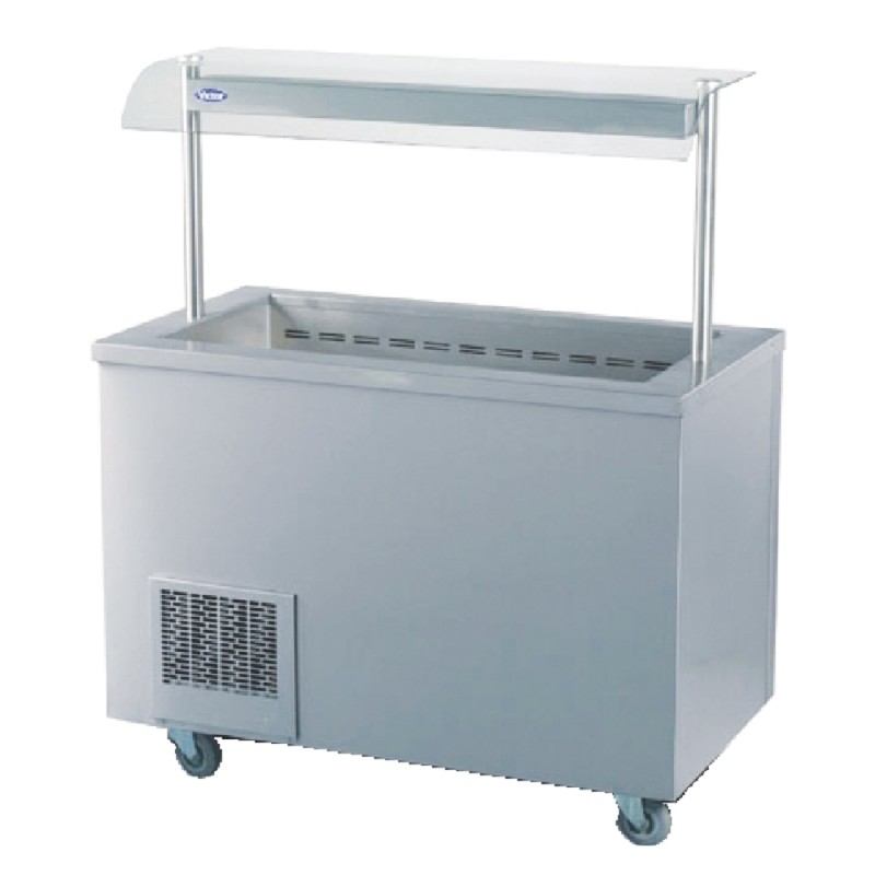 Stainless steel refrigerated air well from Victor suitable for pans up to 65mm deep. Robustly constructed and featuring four heavy duty castors (two lockable) for easy transportation and cleaning