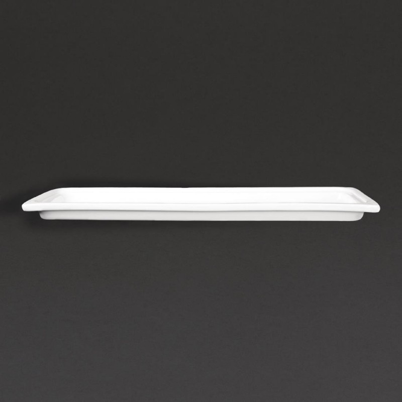 Gastronorm sized porcelain dishes suitable for hot or cold food preparation storage and presentation in buffet displays or as an alternative to traditional stainless steel pans.