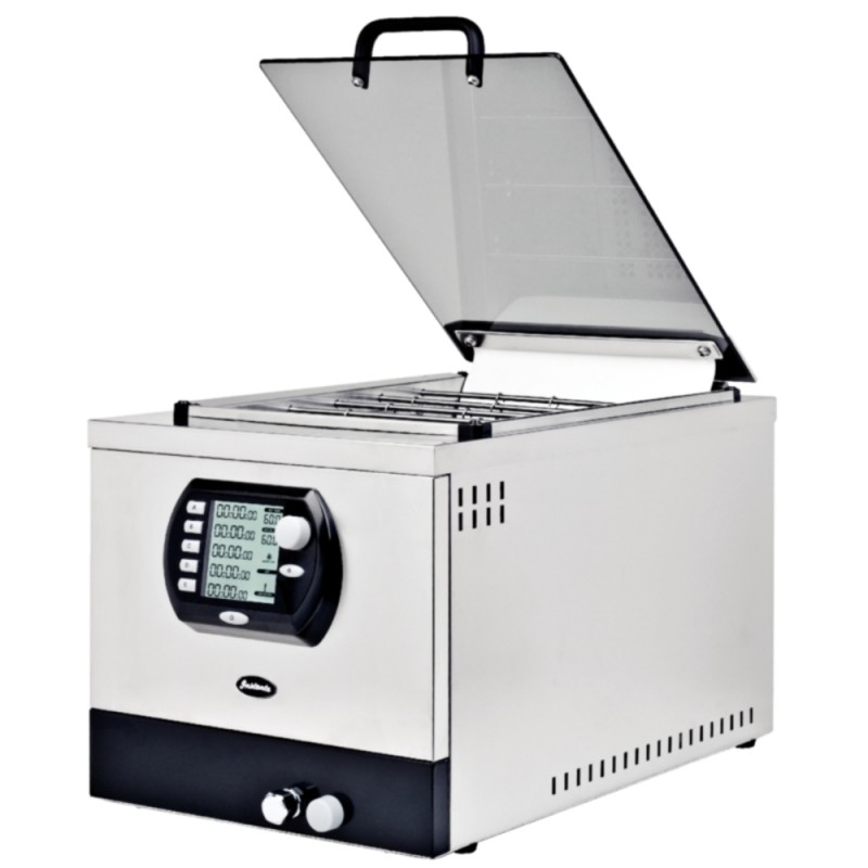 This large Instanta Digital Sous Vide Water Bath SV38 is simple to operate with a rotary temperature control. The push-button controlled agitator pump system circulates water within the tank to maintain constant water temperature and separate timer buttons allow several batches of food to be monitored simultaneously. All timers increase incrementally to the set time indicating how long food has been cooking for rather than displaying how long there is left on the timer. A low water level warning and auto cut-off ensure water never falls below safe operating level. The water bath also features a heavy-duty hinged lid with a safety glass monitoring panel. A rack system and clips are included for hanging bags in bath and the stainless steel tanks are easy to clean.
