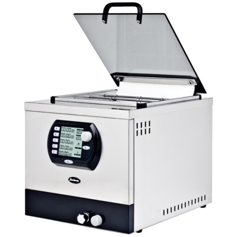 This medium-sized Instanta Digital Sous Vide Water Bath SV25 is simple to operate with a rotary temperature control. The push-button controlled agitator pump system circulates water within the tank to maintain constant water temperature and separate timer buttons allow several batches of food to be monitored simultaneously. All timers increase incrementally to the set time indicating how long food has been cooking for rather than displaying how long there is left on the timer. A low water level warning and auto cut-off ensure water never falls below safe operating level. The water bath also features a heavy-duty hinged lid with a safety glass monitoring panel. A rack system and clips are included for hanging bags in bath and the stainless steel tanks are easy to clean.