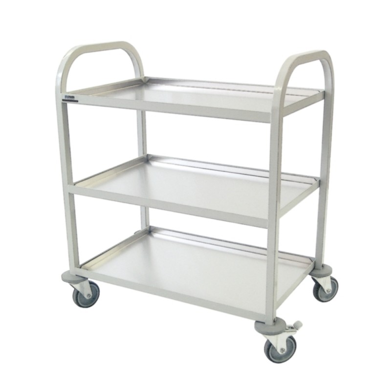 Aluminium 3 tier clearing trolley with removable trays and brakes.