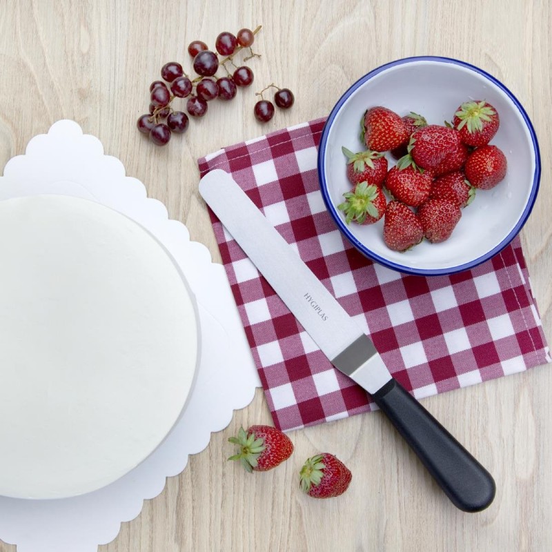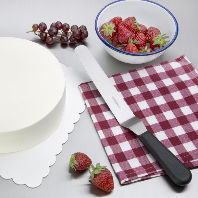 A flexible stainless steel bladed Hygiplas palette knife featuring a cranked plastic handle and an angled blade perfect for spreading icing on a cake.