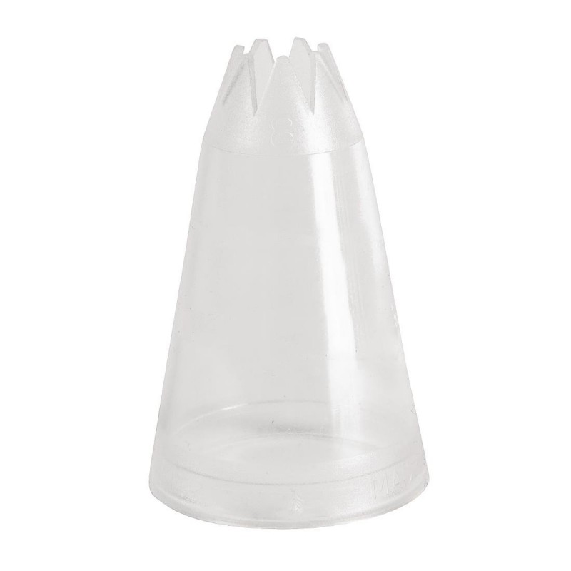 The 12mm opening of this piping nozzle is perfect for creating small patterns and tubing on larger cakes or tight swirls on cupcakes. The star end of the tube makes an attractive shape and the tube has been constructed from shatterproof polycarbonate making it completely food safe.