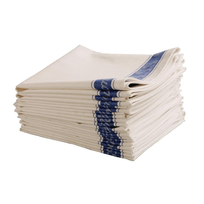 Top quality linen union with blue border cloths. Designed to polish glasses leaving no cloth residue. Three colours available making them ideal for use in designated areas. Sold singly.