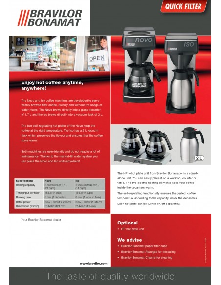 The Bravilor Novo is a popular commercial coffee machine designed for brewing large quantities of coffee quickly and efficiently. Here are some key features: