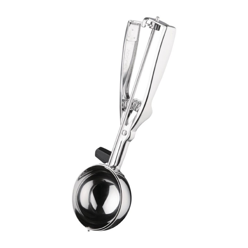 This high quality portioner is suitable for use with all manner of dishes from ice cream to mashed potato rice and more. This stainless steel scoop features a spring loaded handle for quick portioning.