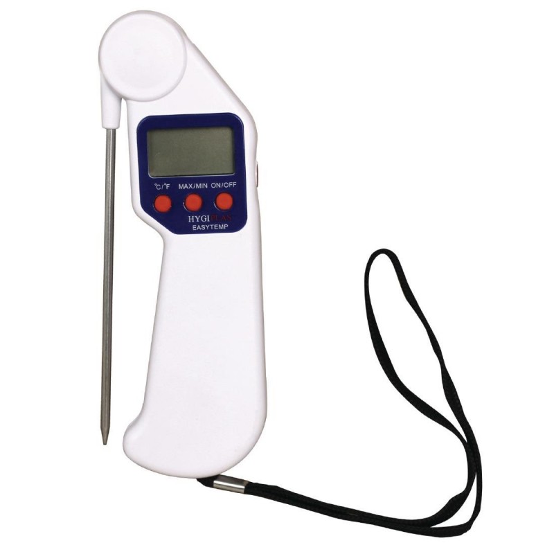 Know the exact temperature of the food you are preparing with the Hygiplas Easytemp thermometer. Featuring a fold-away probe, this handy and easy-to-use pocket thermometer is accurate, reliable and robust. Supplied with a battery, this digital cook's thermometer has an auto on/off function to conserve power and save money on replacement batteries. Packaged with a detachable wrist strap to prevent any accidents, the pocket thermometer ensures both safety and comfort in the kitchen. The thermometer also helps to avoid any risk of cross contamination with a colour coded white design - making it safe for use with baked and dairy goods. Easy to clean and holding a temperature response time of just 15 seconds, the thermometer guarantees a fast and cost-effective approach to food safety in the kitchen. Declaration of Conformity included in user manual, supplied with product and available online.